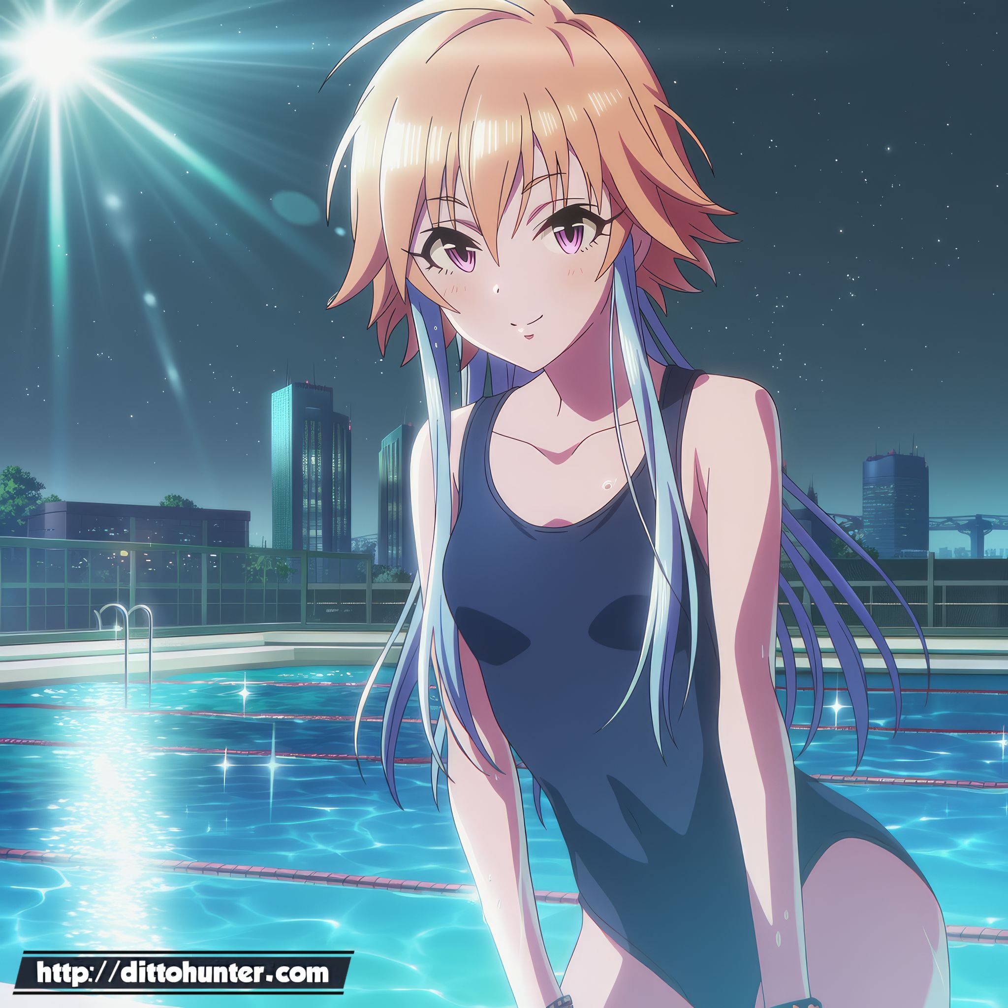 Asuka Ninomiya steps onto the poolside, her confidence radiating as she prepares for the Summer Splash Idol Challenge. Her Japanese school swimsuit clings to her figure, drawing attention as she strikes a series of sexy poses, determined to steal the spotlight and showcase her unique charm. The atmosphere is electric with anticipation.